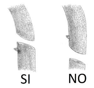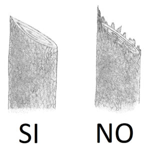 - Effettuare un taglio netto. Il taglio del ramo o del pollone deve essere netto, senza strappi nel fusto o pezzettini intorno al taglio. Per far questo è necessario che gli attrezzi che si utilizzano siano adeguatamente affilati e conservati correttamente. Molto importante è la destrezza dell’operatore, che si acquista con l’esperienza.